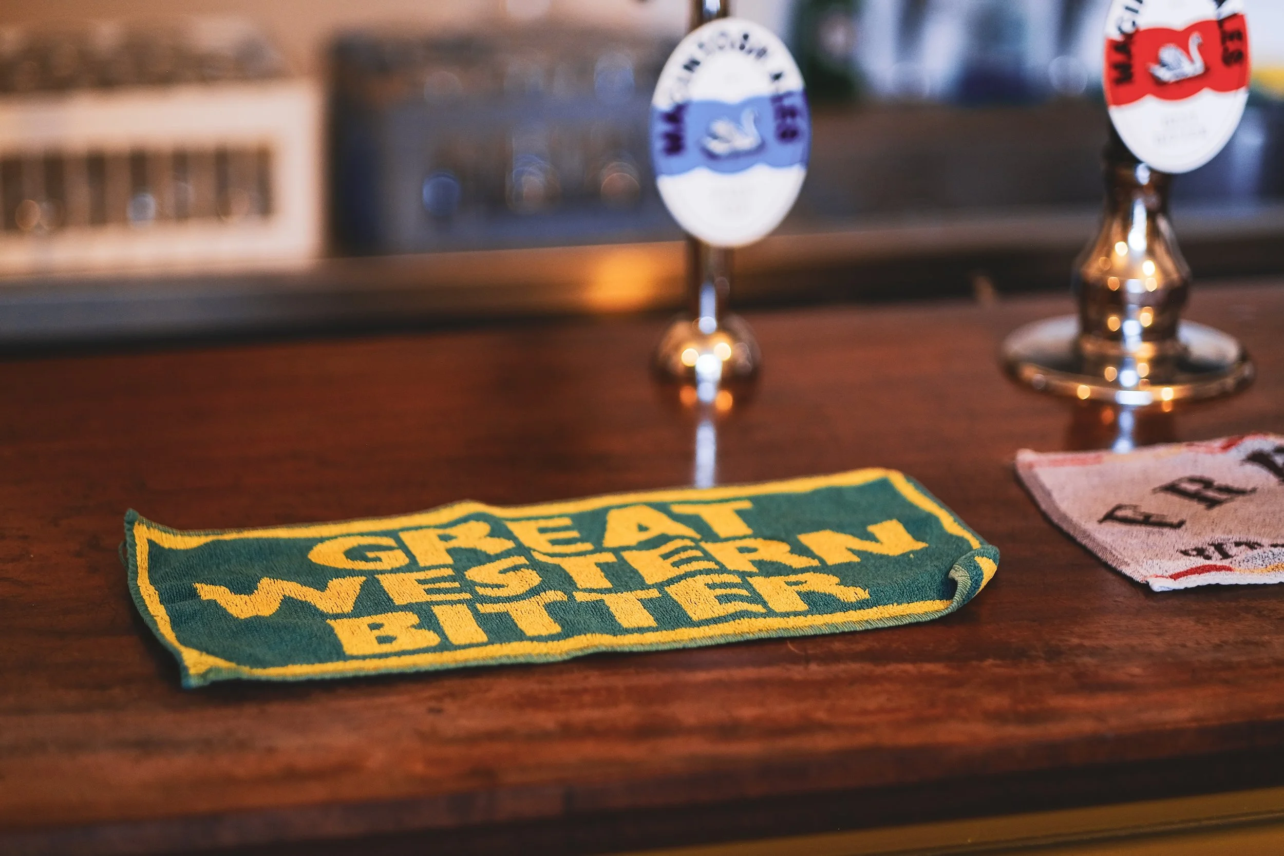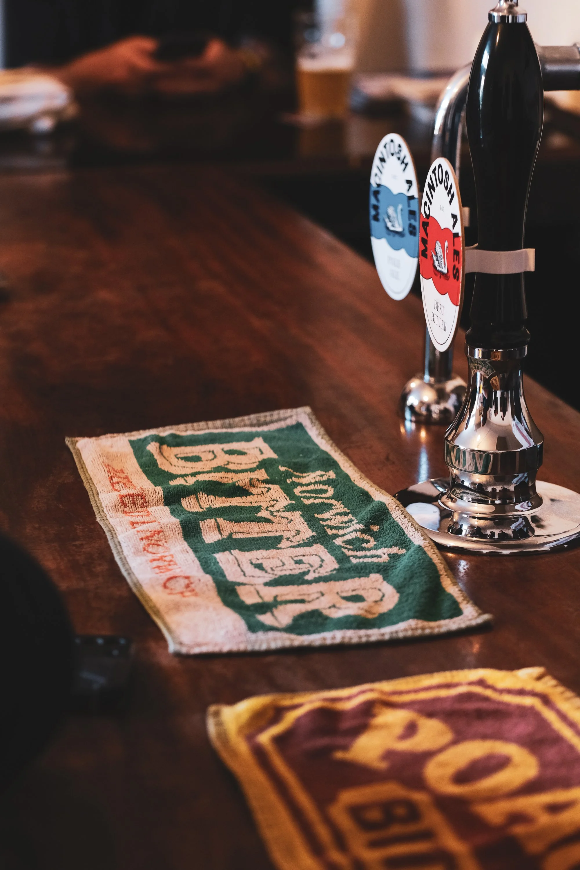Apart from customers crowded close on a busy Friday night or a regular and their book on a Sunday afternoon, the ale house’s bar is home to three things: a well-polished hand pump, a keg font, and one of a rotating selection of vintage bar towels.