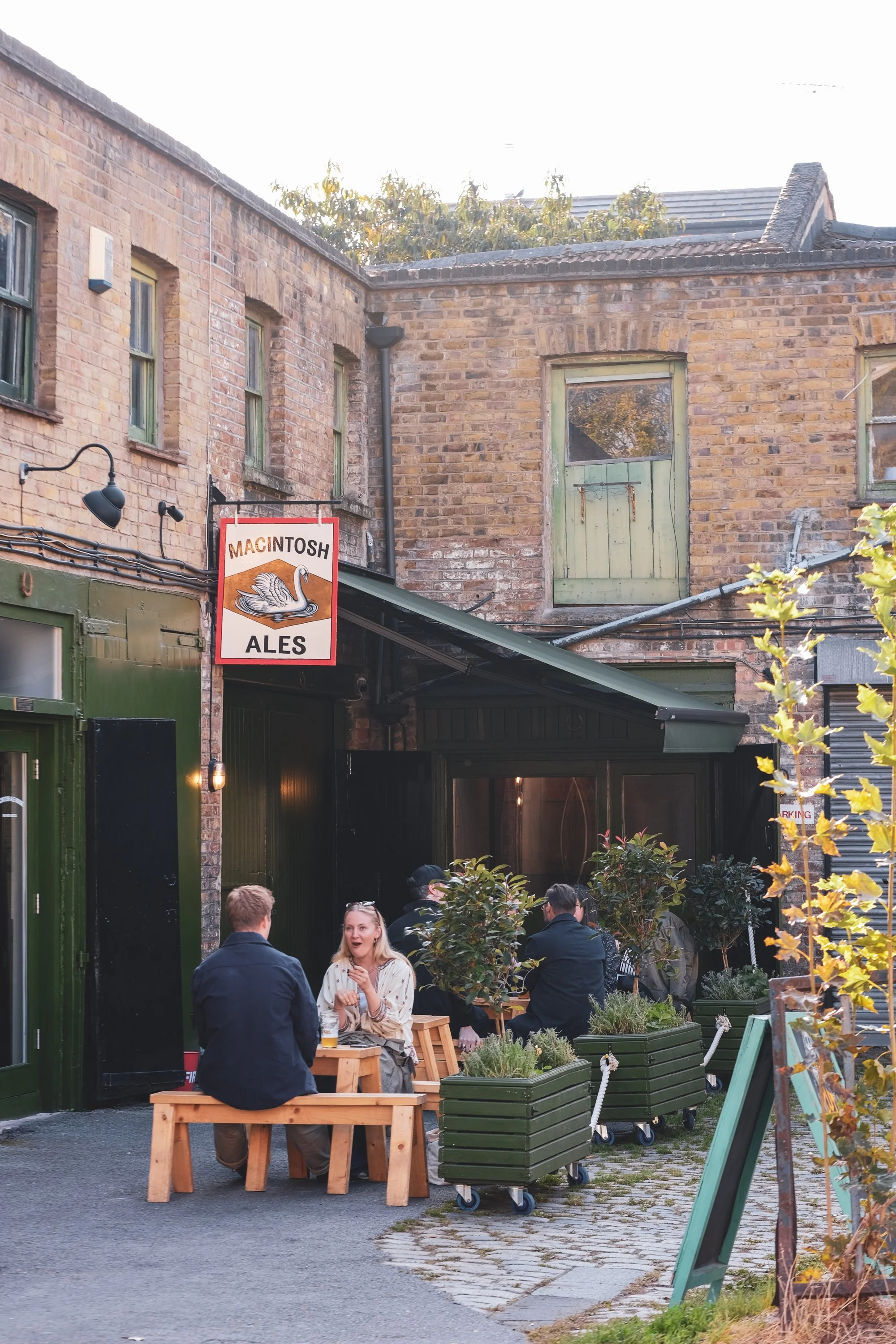 Stroll by on a warm summer’s evening, or on a Saturday lunchtime, and there’s a complete transformation. A hair salon on the corner of the yard, artists’ studios on one side with plastic-wrapped prints and paintings on display, and on the other is Macintosh Ales and its ale house: a small drinking space, a warehouse, a “function room.”