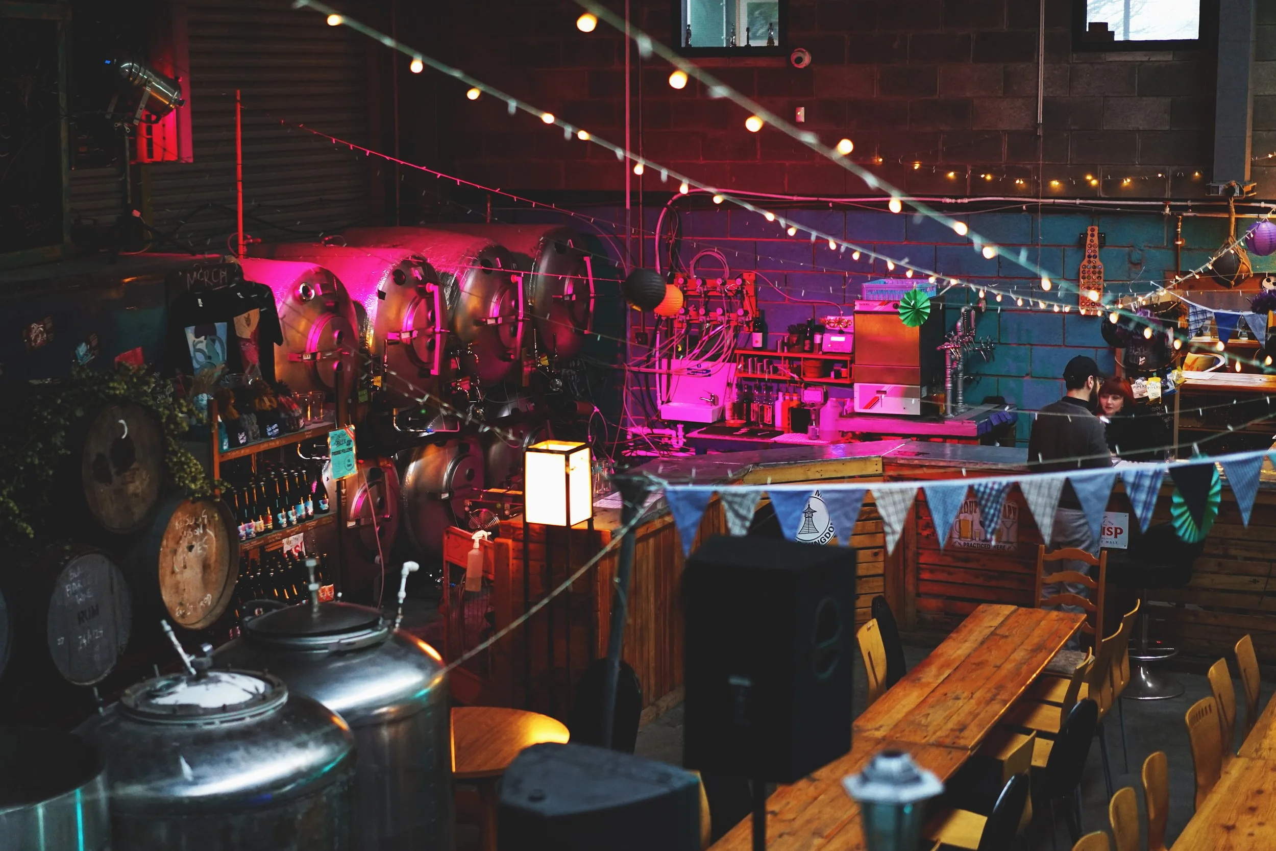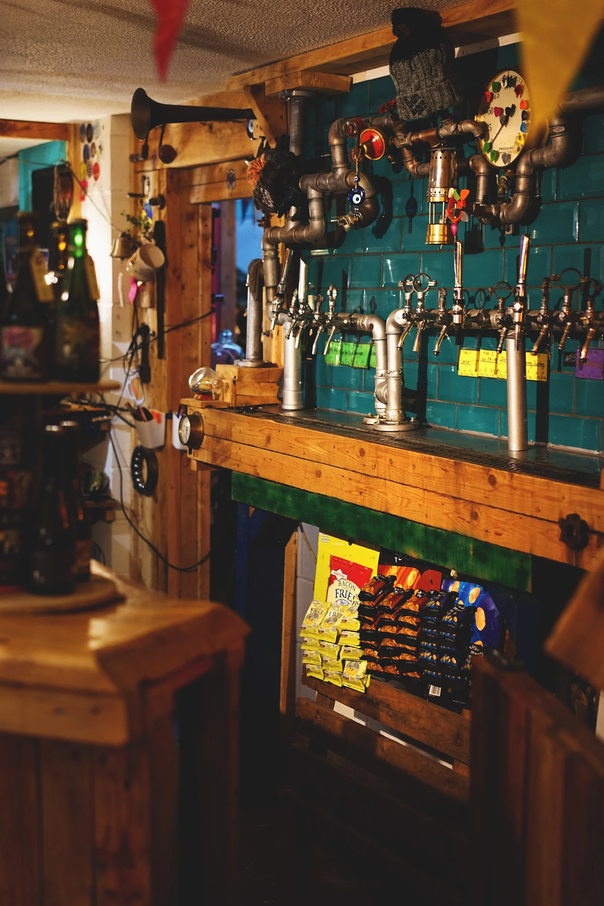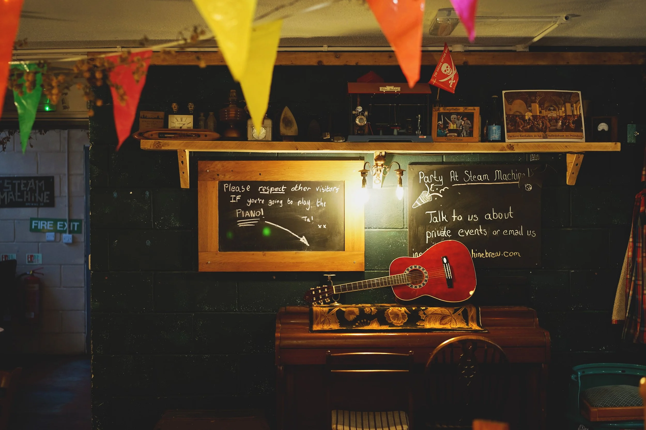 Steam Machine’s taproom is divided between two main rooms, both of which are family- and dog-friendly. The first is snug-like, resembling a fairly typical traditional British pub—there’s a bar, cushioned seats, and even a piano that invites patrons to tickle the ivories. Then there’s the room where the magic happens.